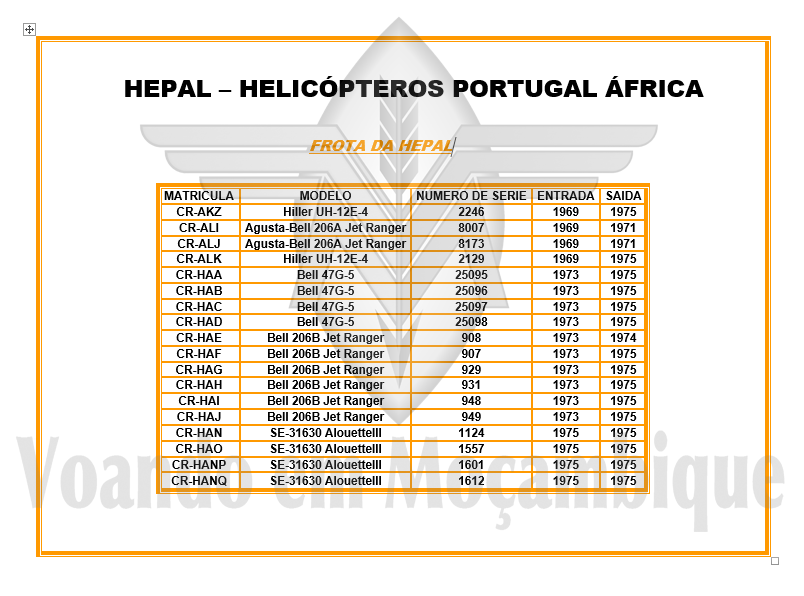 FAV 310 - em Vila Pery (antigo destacamento da FAV 301 VP), sendo os meios aéreos compostos por dois Auster (CR-AIO vindo de Vila Cabral e CR-AIR).