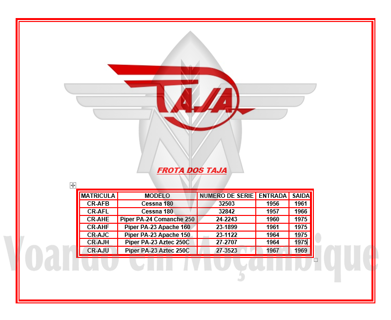 aviões: um Piper Tripacer (CR-AGN), dois Piper Colt (CR-AHJ e CR-AHN), um Chipmunk (CR-AEE) e um Piper Apache (CR-AFZ), a que se juntariam mais tarde um Chipmunk (CR-AEH), um Tiger Moth (CR-AFP) e dois Taylorcraft (CR-ACA e CR-ABZ).