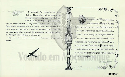 O Voando em Moçambique é um pequeno tributo à História da Aviação em Moçambique. Grande parte dos seus arquivos desapareceram ou foram destruídos e o que deles resta, permanecem porventura silenciosos nas estantes de muitos dos seus protagonistas. A História é feita por todos aqueles que nela participaram. É a esses que aqui lançamos o nosso apelo, para que nos deixem o seu contributo real, pois de certo possuirão um espólio importante, para que a História dessa Aviação se não perca nos tempos e com ela todos os seus “heróis”. As gerações futuras de certo lhes agradecerão. Muitos desses verdadeiros heróis, ilustres aventureiros desconhecidos, souberam desafiar os perigos de toda a ordem, transportando pessoas e bens de primeira necessidade ou evacuando doentes, em condições meteorológicas adversas, quais “gloriosos malucos das máquinas voadoras”. Há que incentivar todos aqueles que ainda possuam dados e documentos que possam contribuir para que essa História se faça e se não extinga com eles, que os publiquem, ou que os cedam a organizações que para isso estejam vocacionadas. A nossa gratidão a todos aqueles que ao longo dos tempos se atreveram e tiveram a coragem de escrever as suas “estórias” e memórias sobre a sua aviação. Só assim a História da Aviação em Moçambique se fará verdadeiramente, pois nenhum trabalho deste género é suficientemente exaustivo e completo. A todos esses ilustres personagens do nosso passado recente que contra tudo e todos lutaram para que essa história se fizesse, a nossa humilde e sincera homenagem.