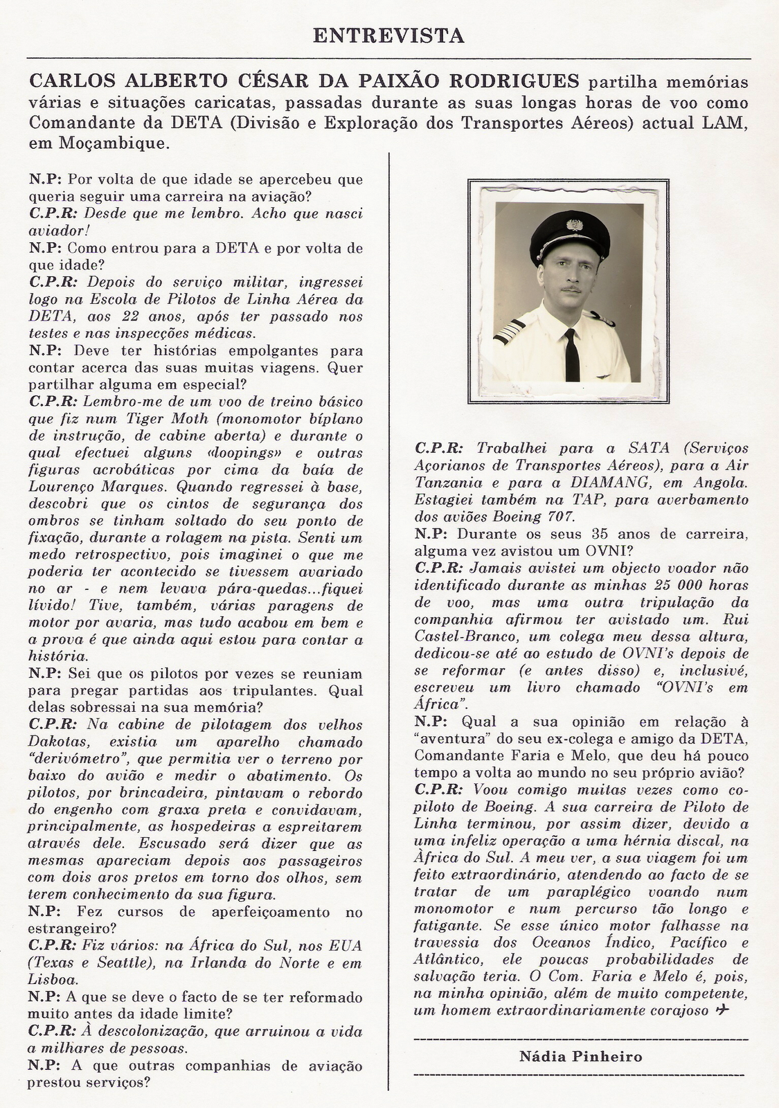 Lembro-me com clareza daquele dia 24 de Abril do ano de 1966 quando em minha casa, em Lourenço Marques, recebi um telefonema daquele que viria a ser o meu novo patrão, Piet van der Woede, convidando-me para ir trabalhar para a sua empresa como vendedor dos aviões PIPER.